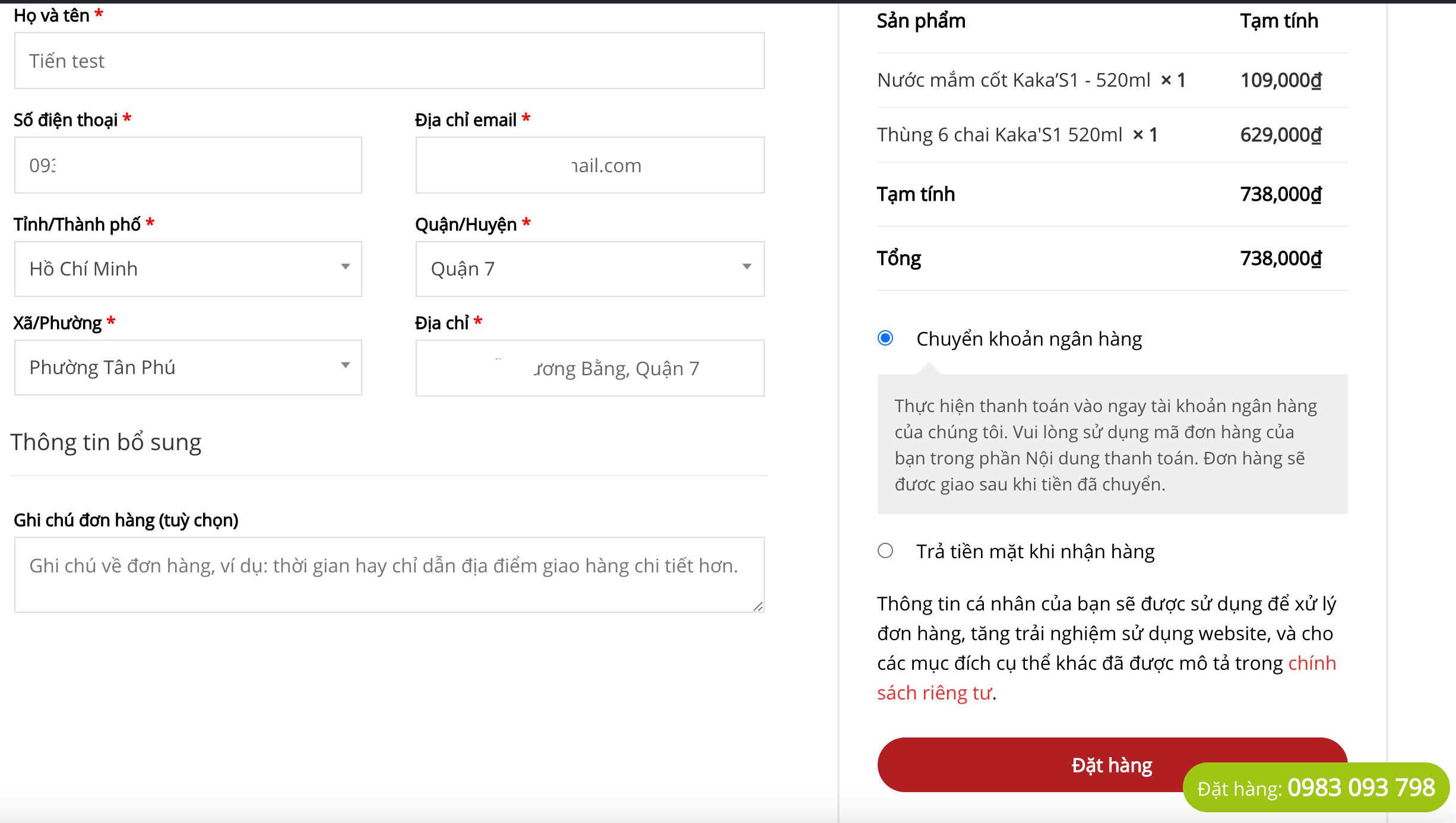 Quý khách nhập địa chỉ nhận hàng thông tin người nhận và phương thức thanh toán trước khi nhấn nút ĐẶT HÀNG.